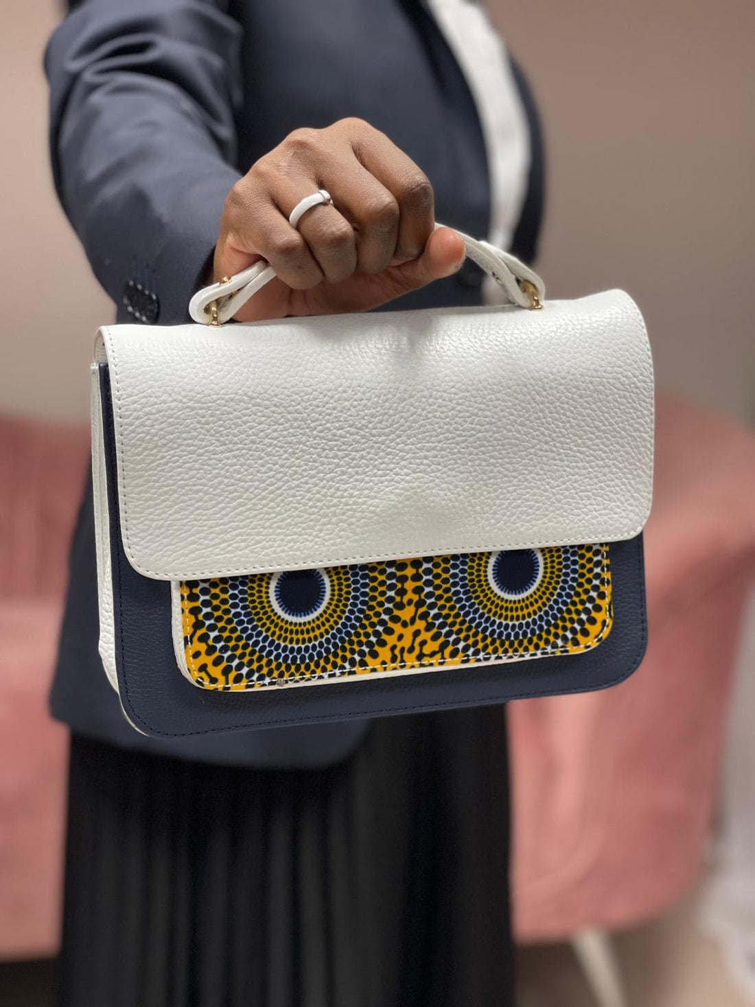 Le sac MENB en cuir lisse jaune avec le tissu ethnique Kente est un choix...