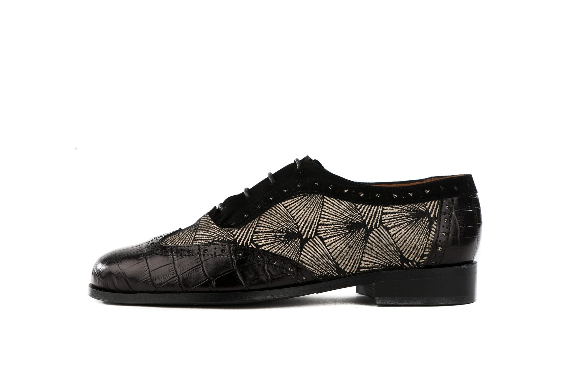 De jolies derbies, une coupe classique twistée par du cuir croco et une touche de tissu tissé lumineux!