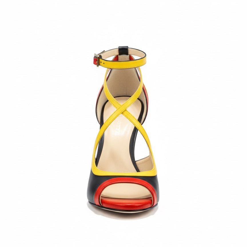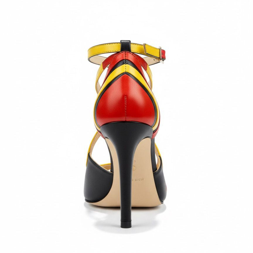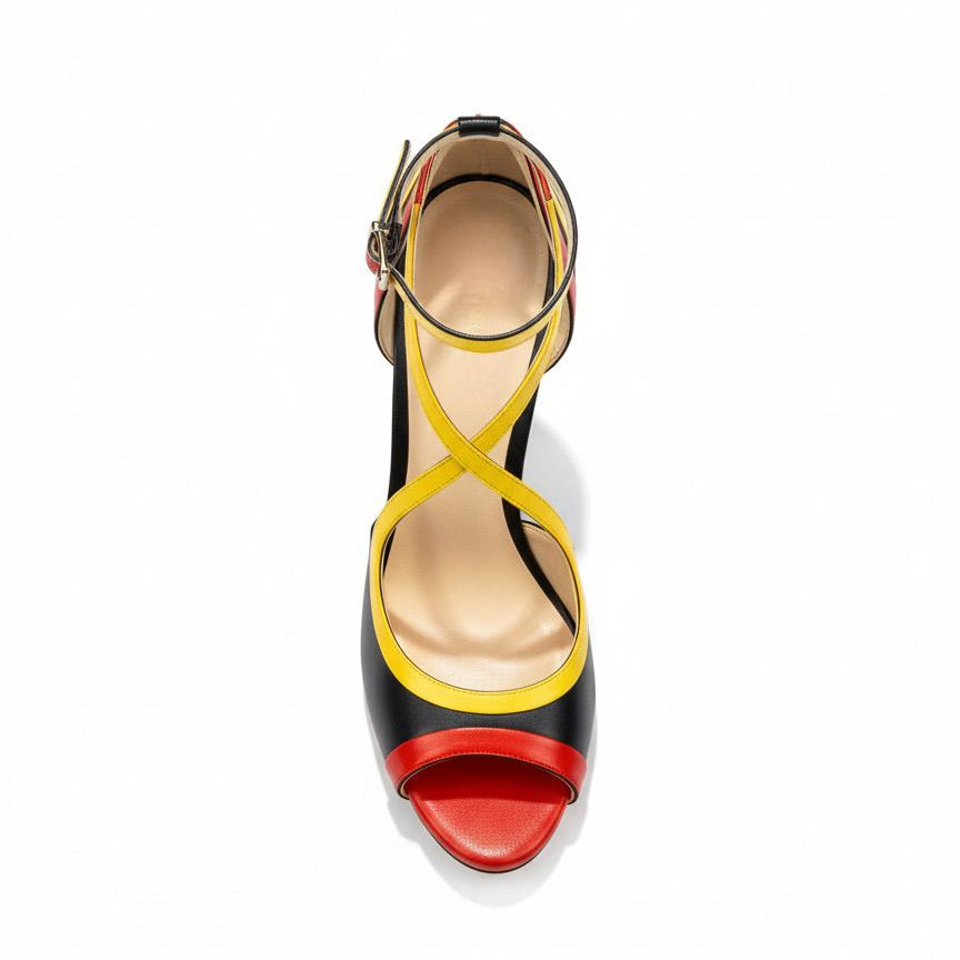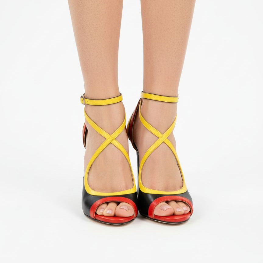 L'audace incarnée. ANGOLA célèbre la nation angolaise à travers un jeu graphique de cuirs rouge, noir et jaune qui composent les couleurs emblématiques du drapeau. Chaque bande de couleur est soigneusement travaillée pour créer un effet dynamique et moderne, entre lignes épurées et découpes audacieuses.