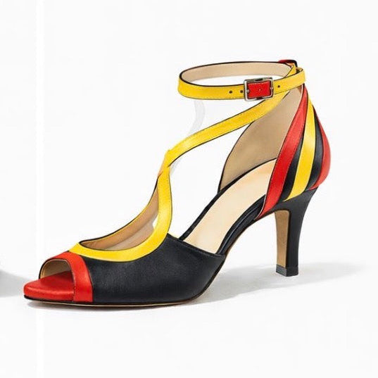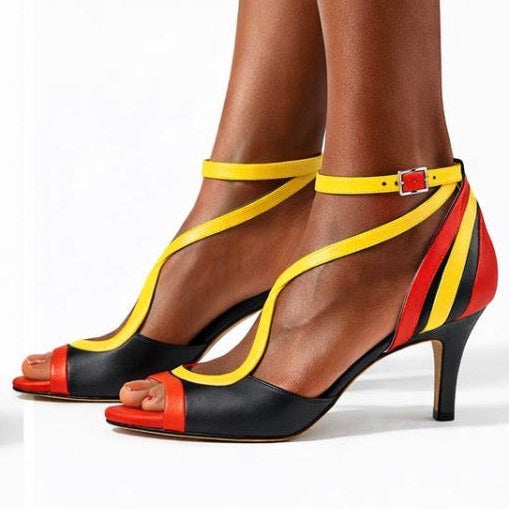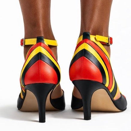 L'audace incarnée. ANGOLA 5 CM célèbre la nation angolaise à travers un jeu graphique de cuirs rouge, noir et jaune qui composent les couleurs emblématiques du drapeau. Chaque bande de couleur est soigneusement travaillée pour créer un effet dynamique et moderne, entre lignes épurées et découpes audacieuses.