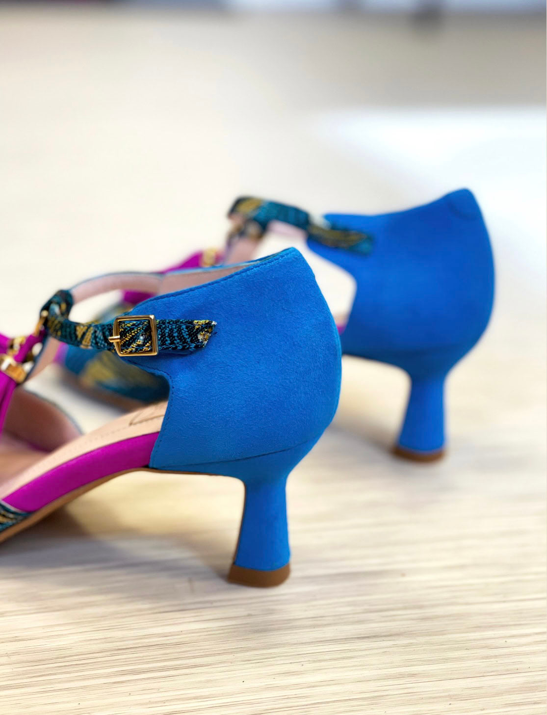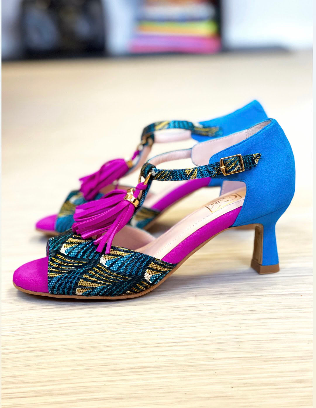 Ce modèle bi-matière a une hauteur de talon de 5 cm. Le tour de cheville est décoré d'une lanière. Ces chaussures sont idéales pour la danse.