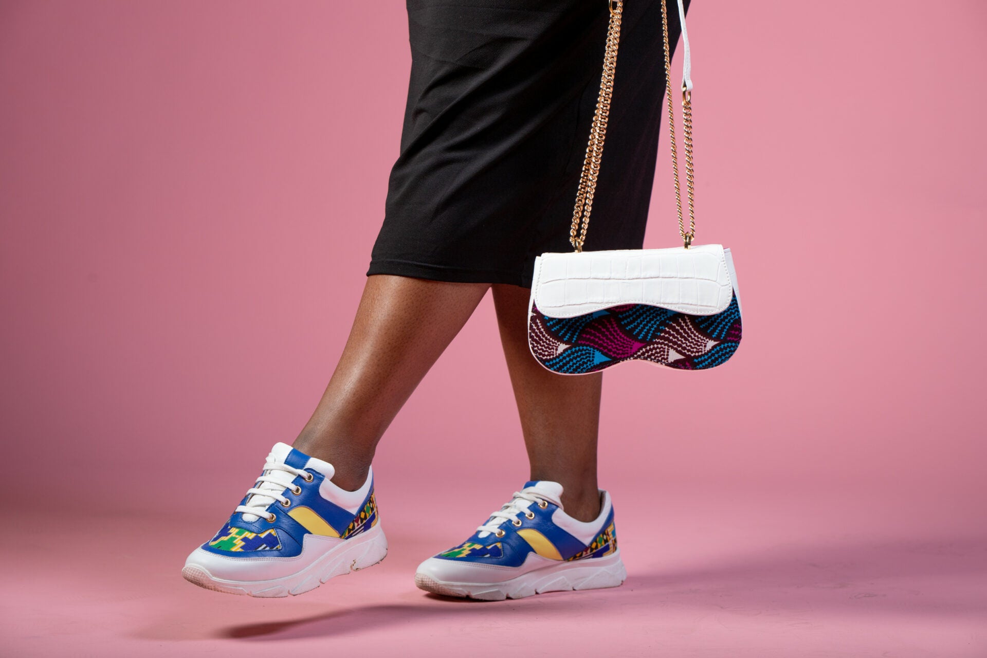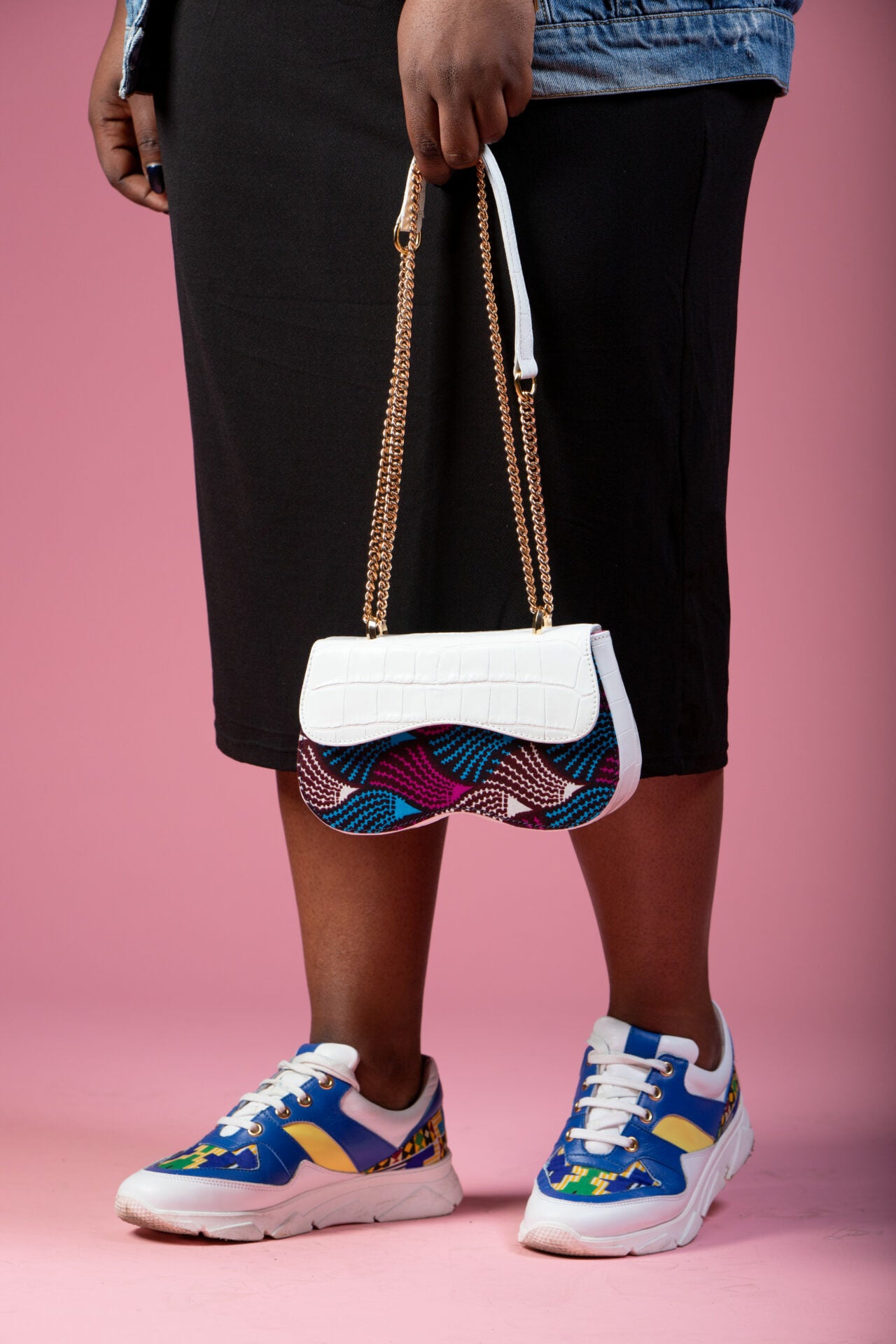 Sac NUF en cuir blanc imitation croco avec le tissu ethnique wax est un choix audacieux pour ajouter du caractère à votre tenue.