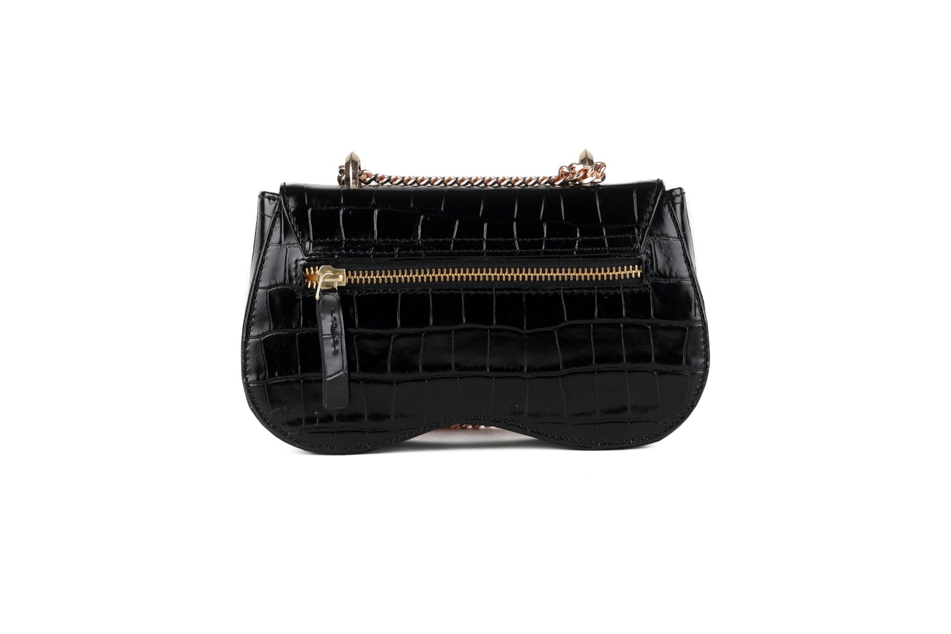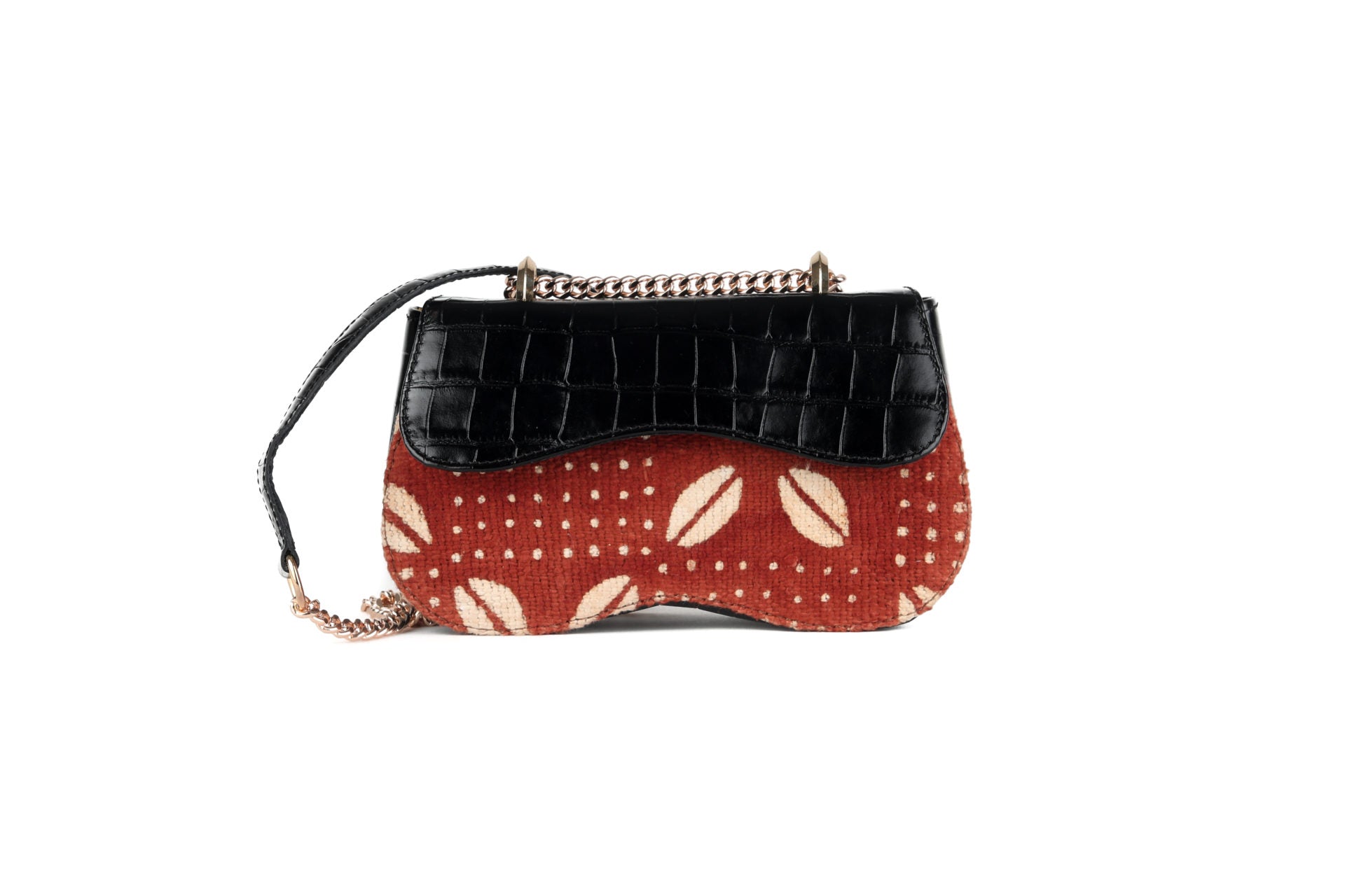 Les lignes arrondies de la pochette ajoutent une touche de douceur et de féminité, tandis que la chaîne ajoute une touche de sophistication et de modernité. Cette pochette est polyvalente et peut être portée avec une tenue décontractée pour ajouter une touche de style, ou avec une tenue plus formelle pour un look plus chic.En résumé, ce sac en cuir noir imitation croco avec le tissu Bogolan est un choix unique et élégant pour compléter votre look.